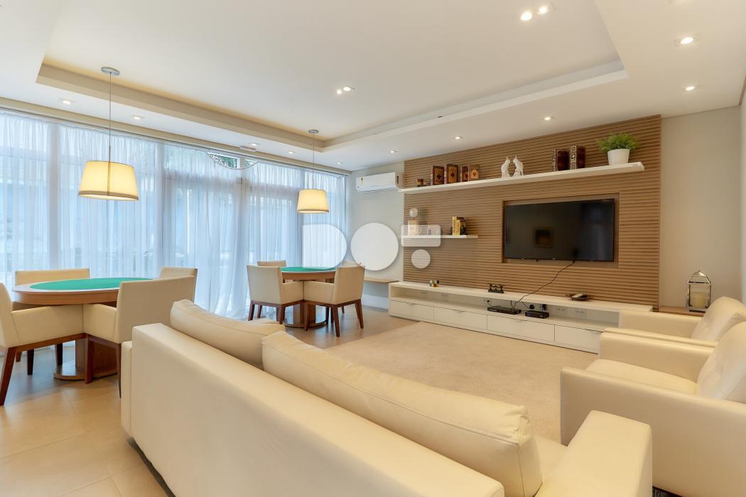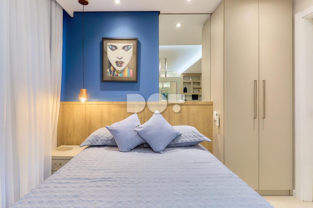 O espaço foi inteligentemente planejado para oferecer integração entre os ambientes, com móveis sob medida, iluminação moderna e uma TV que gira entre a sala e o quarto.
