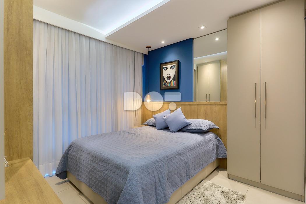 O dormitório conta com armários amplos, cama e criados-mudos.