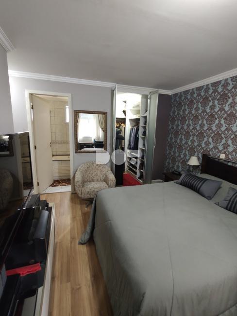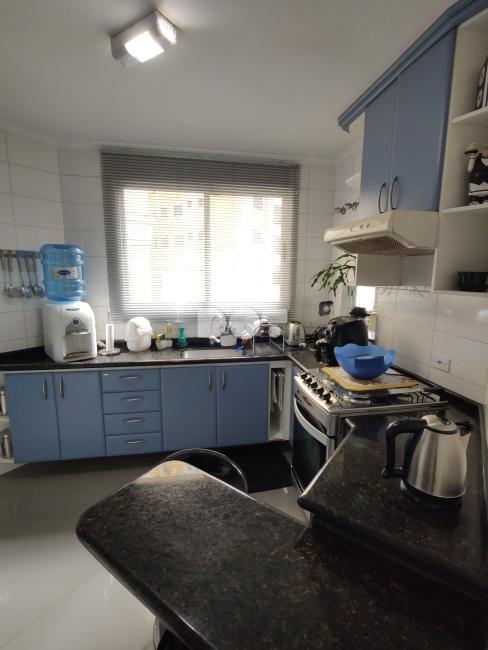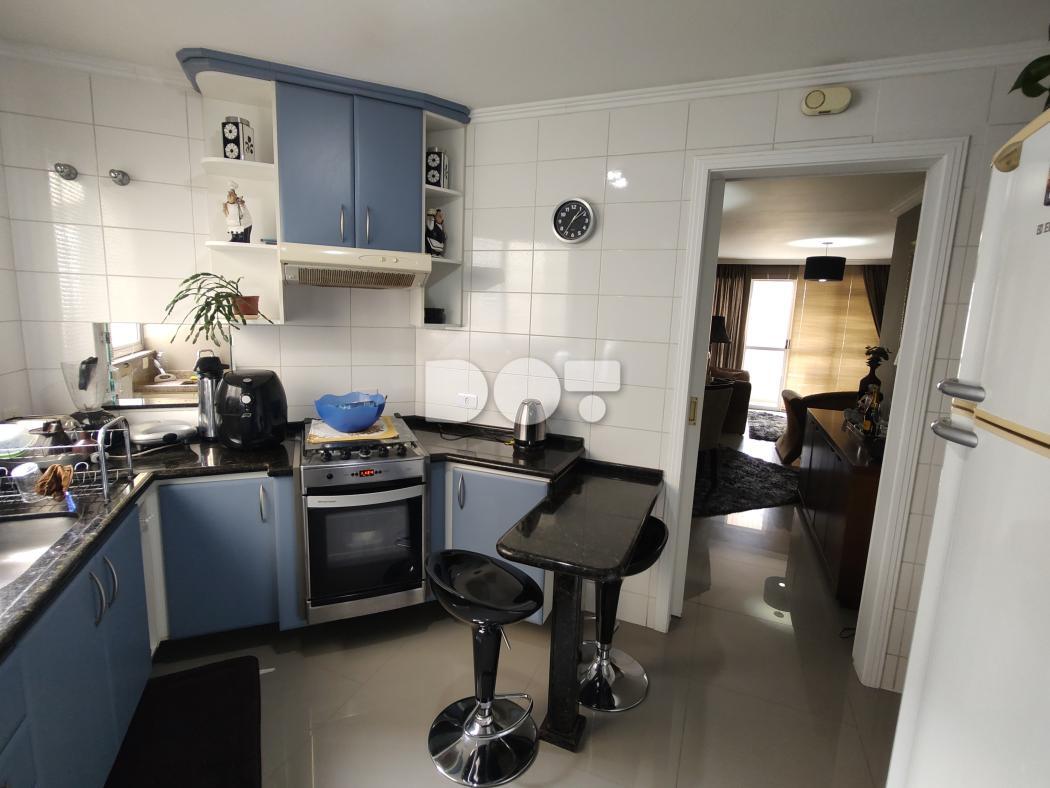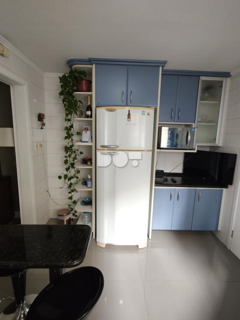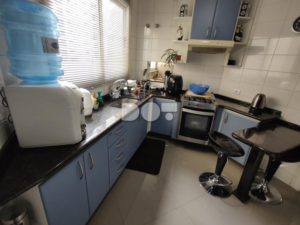 Na cozinha armários planejados, geladeira, microondas, fogão e depurador.