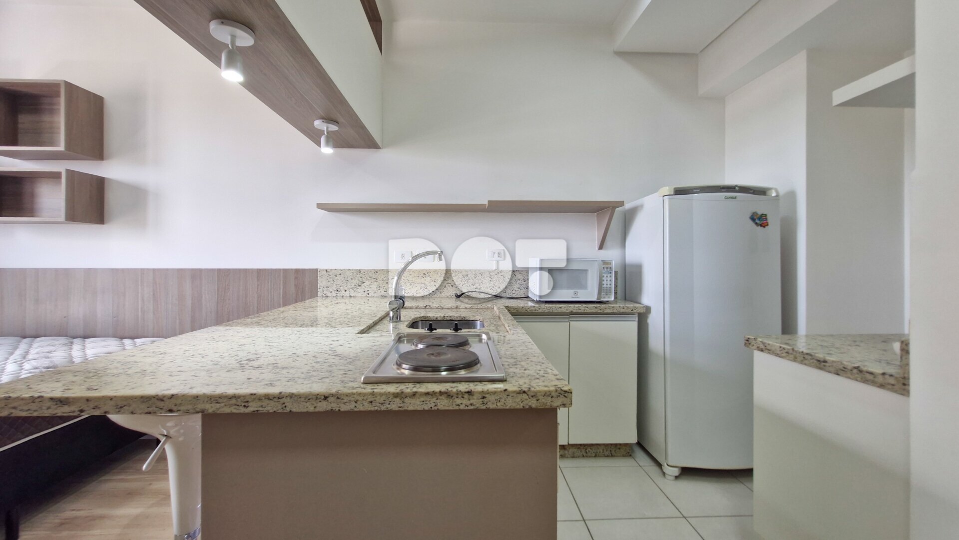 A cozinha é equipada com móveis planejados e cooktop elétrico de 2 bocas. O ambiente de sala/quarto conta com bancada para refeições, com duas banquetas, painel para TV e armário planejado. O banheiro dispõe de armário embutido, espelho e box de vidro.