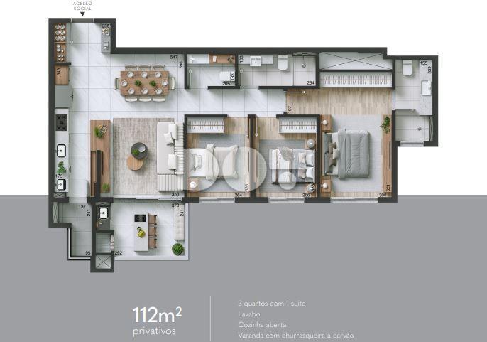 - 112m² de área privativa com planta fluida e integração social