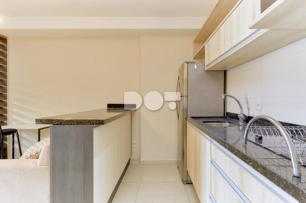 Mobílias: Cozinha c/ armários planejados, cooktop, microondas, geladeira, balcão e cadeira. (contém talheres, louças)