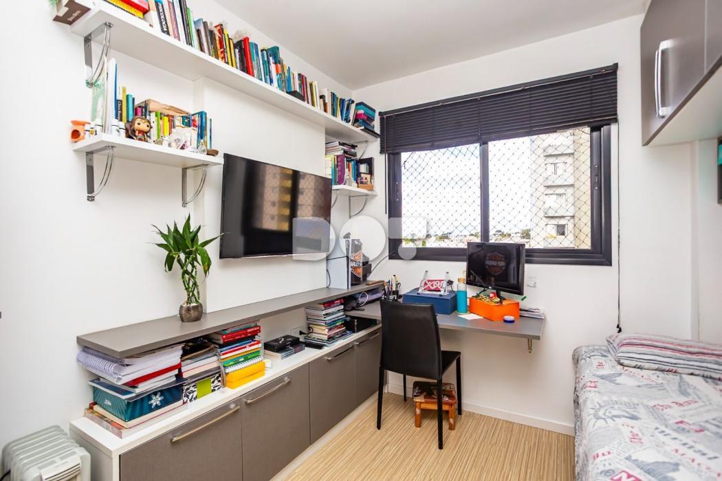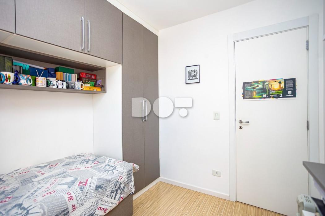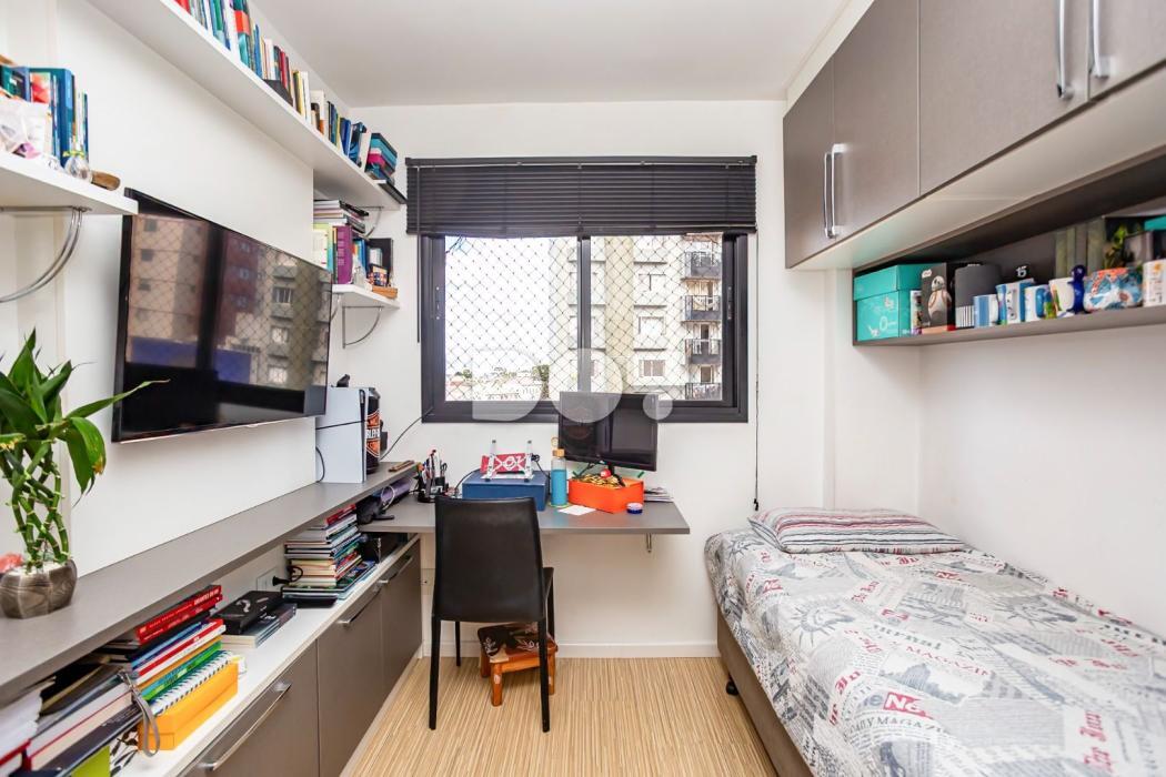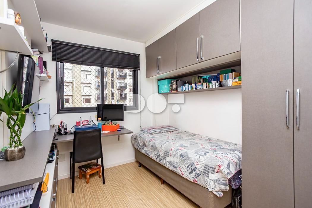 - Quarto solteiro com cortina, armário, mesa de escritório, painel e prateleiras;