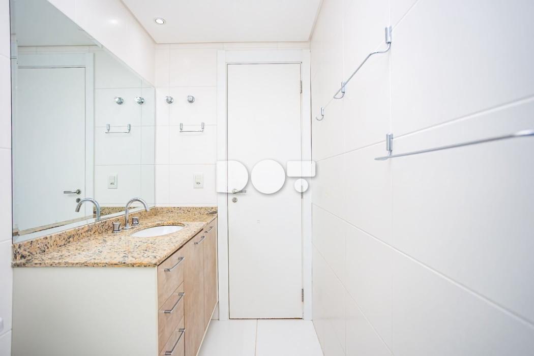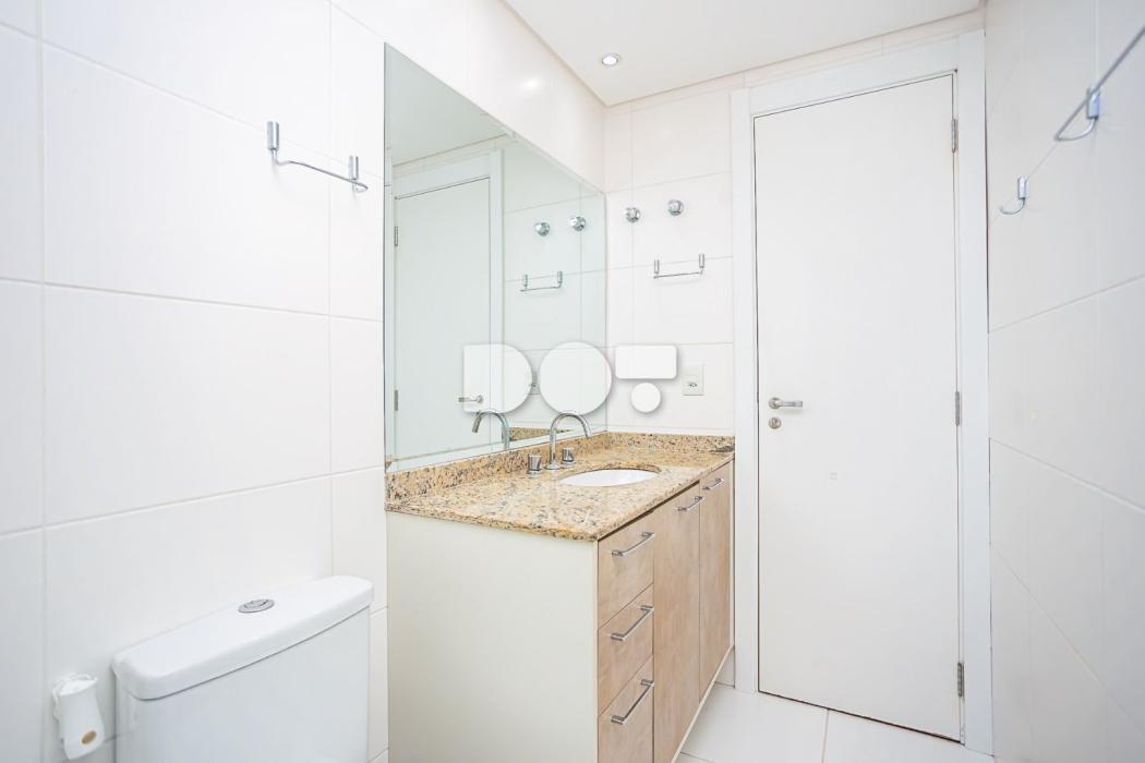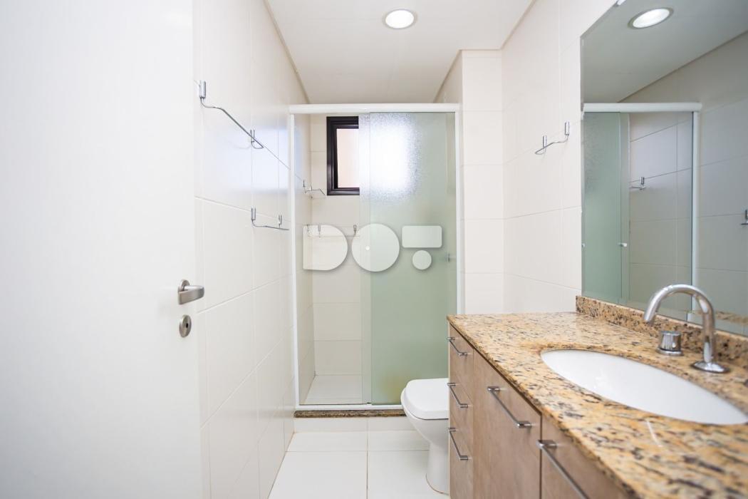 - Banheiro com box e gabinete de pia tampo em granito;