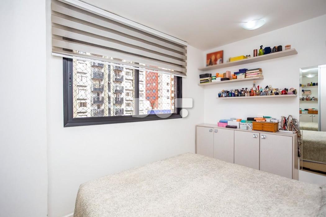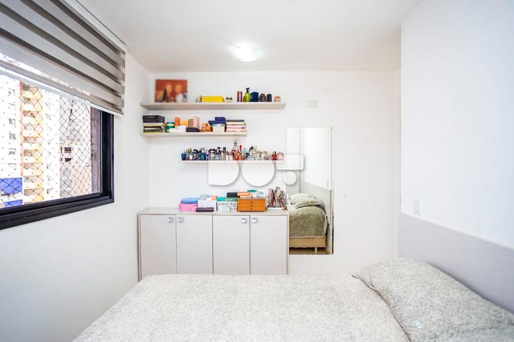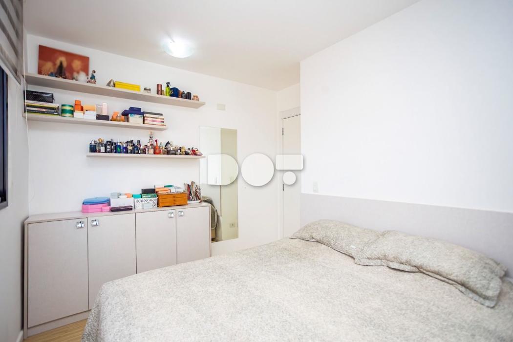- Quarto casal com cortina, espelho, cabeceira, armário, prateleiras e sapateira;