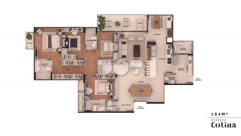 Com arquitetura assinada pelo renomado Bacoccini e paisagismo exclusivo de Takeda, o RESERVA COLINA é composto por 4 torres; Brisa, Relva, Bruma e Sereno, cada uma com 8 andares e 4 apartamentos por andar, garantindo privacidade, sofisticação e um estilo de vida incomparável.