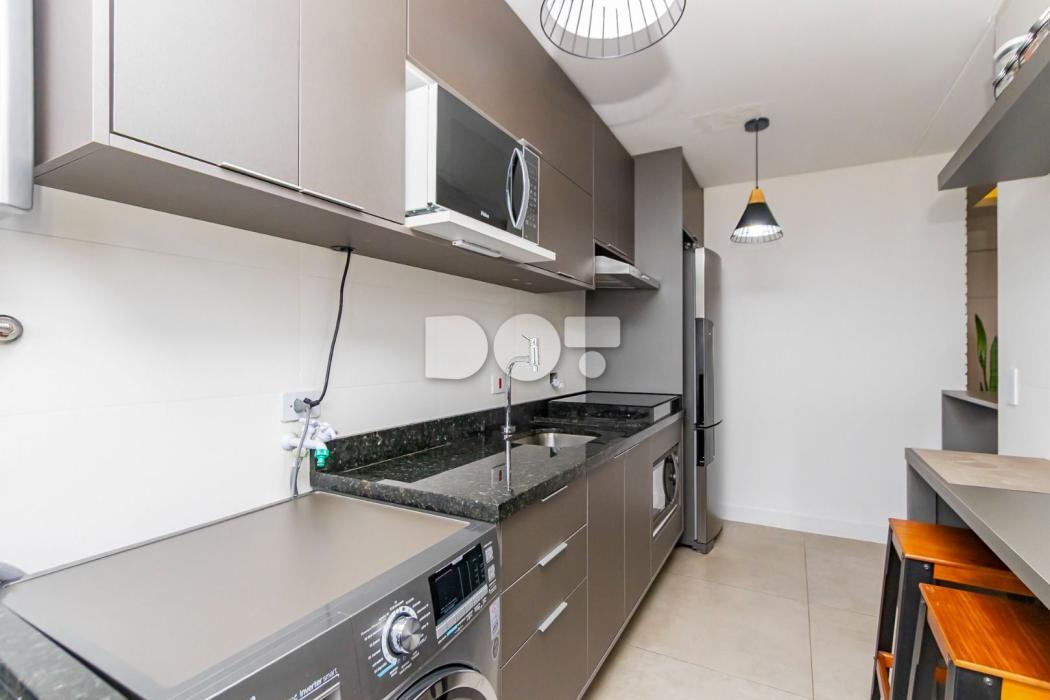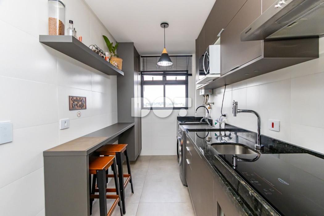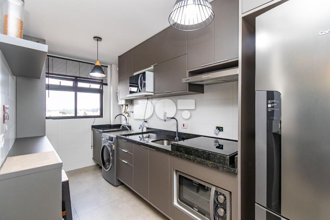 Cozinha conjugada com lavanderia, equipada com armários planejados;
