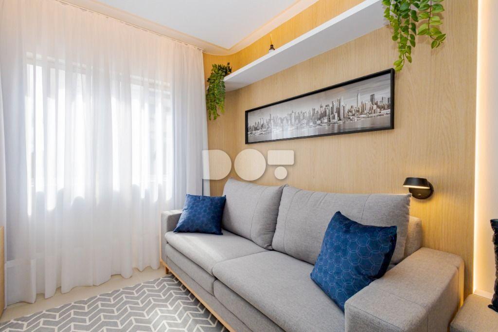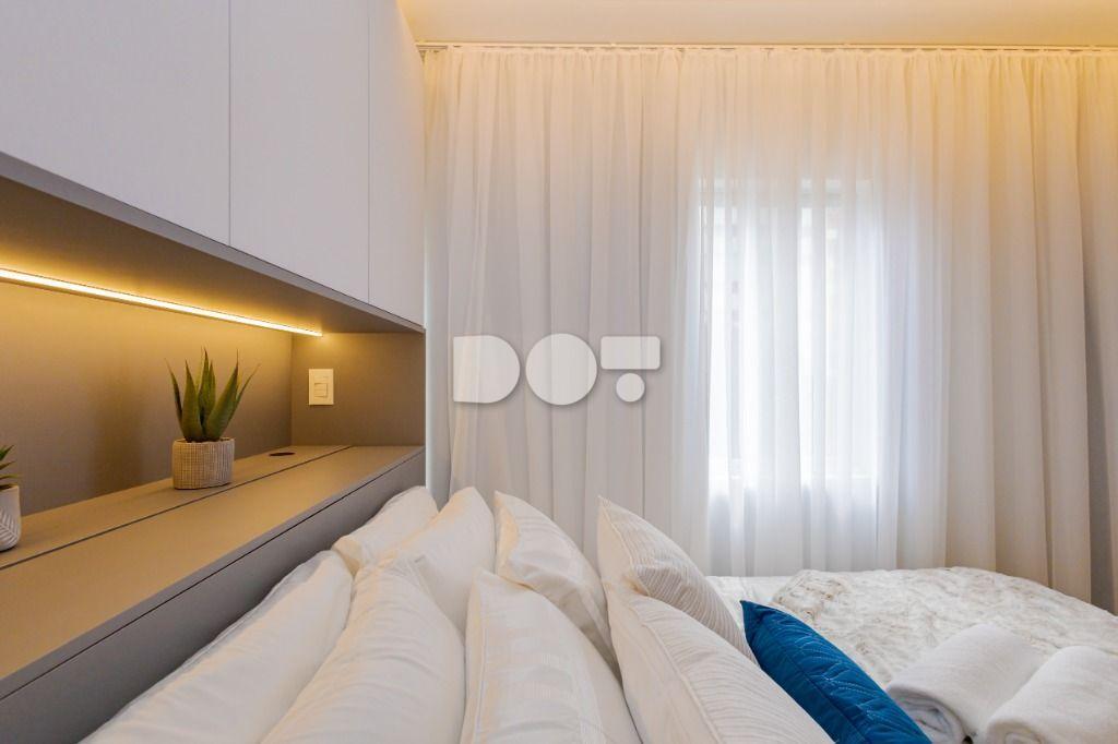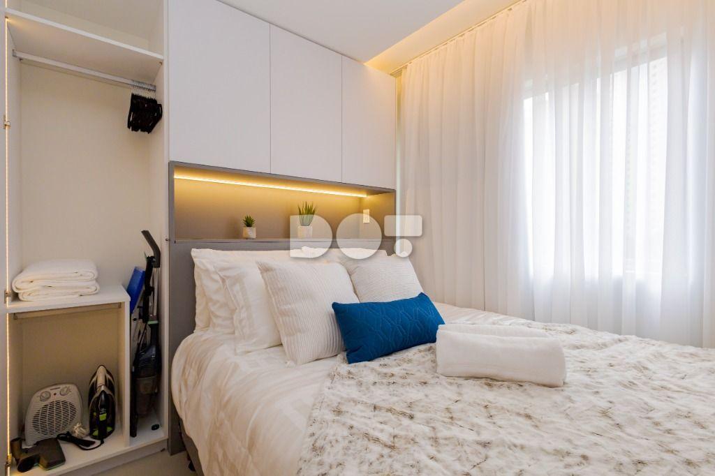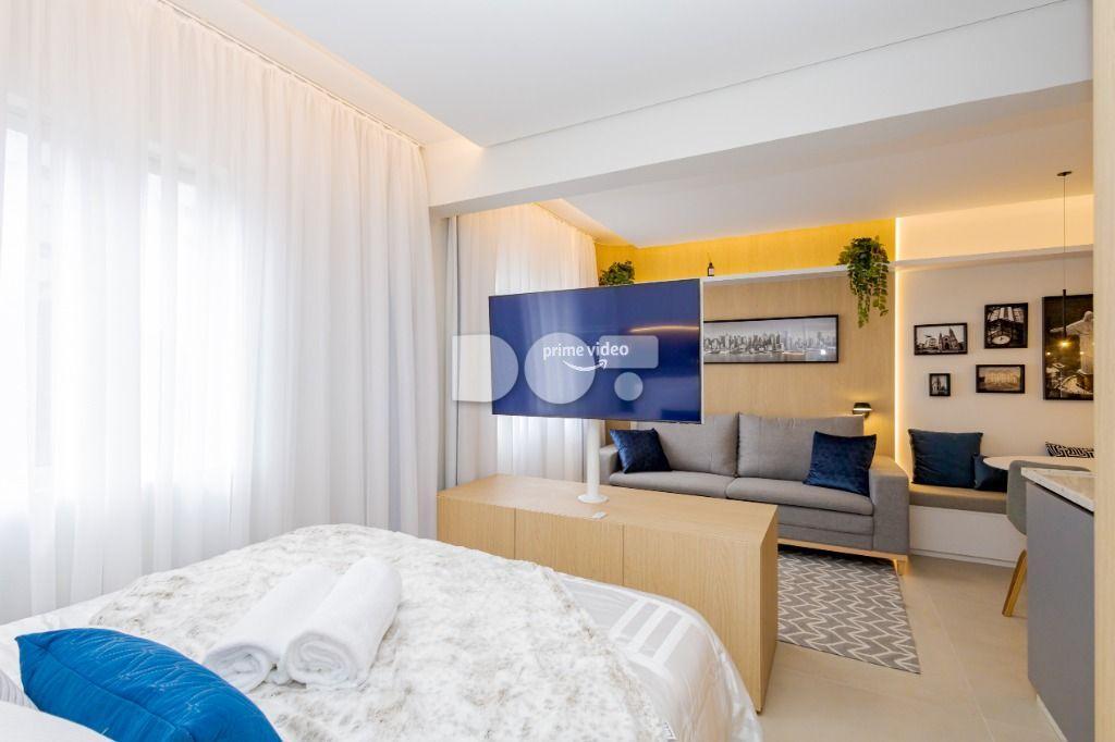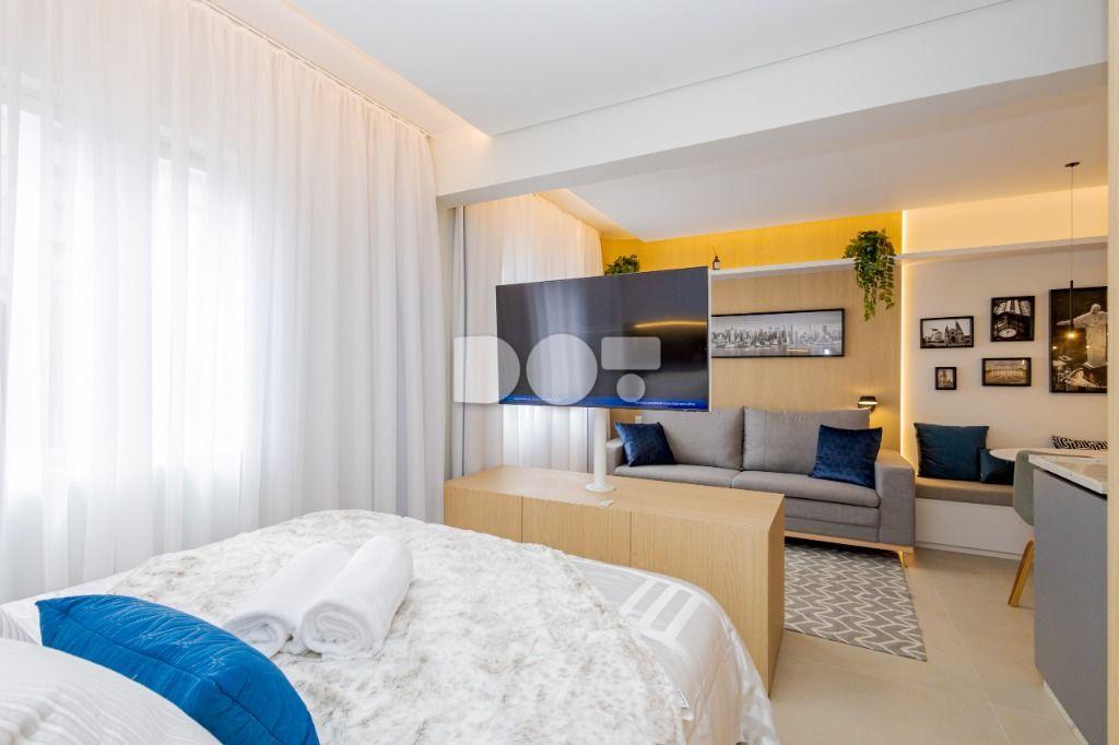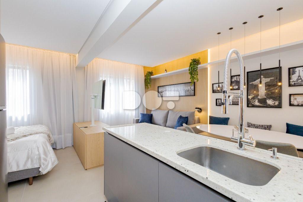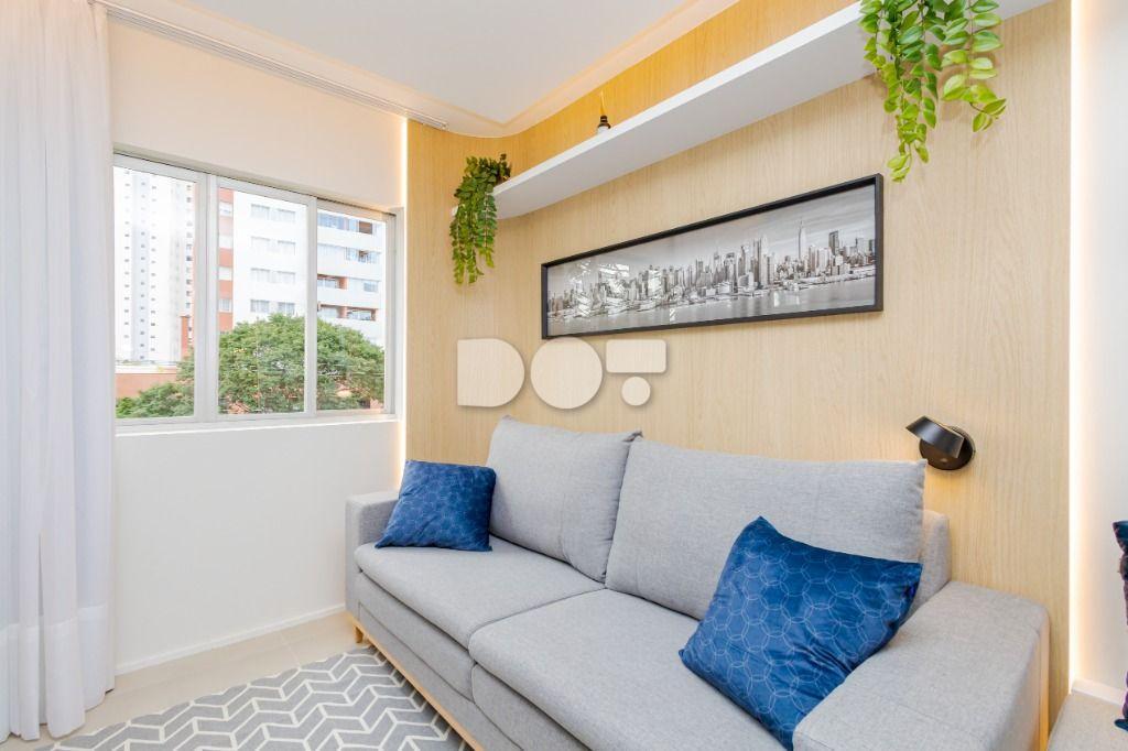 Studio todo reformado com acessórios de qualidade e ótimo gosto. Cozinha planejada com móveis de primeira linha, ficando cooktop, forno e coifa. Sala conjugada com o quarto em teto em gesso e iluminação em led. No banheiro vidro em blindex. O imóvel está localizado em frente a Faculdade Evangélica Mackenzie no Bigorrilho.
