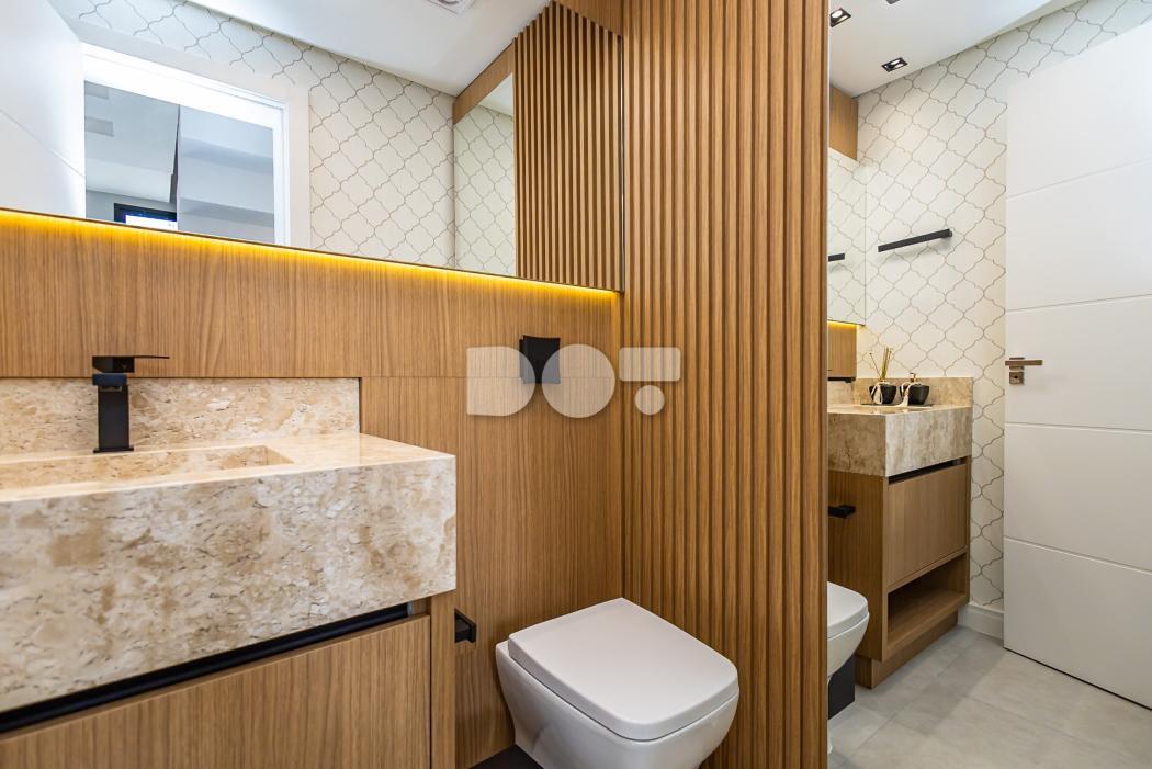 - Banheiro social com pia esculpida em mármore, louça moderna, piso aquecido, ducha higiênica, box e metais instalados