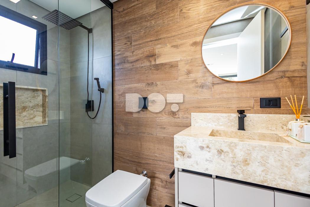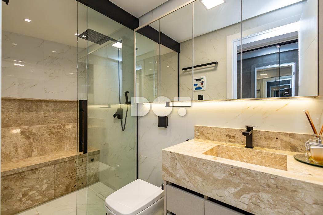 - Banheiro suíte com pia esculpida em mármore, piso aquecido, ducha higiênica, banco de sauna com led, box e metais instalados