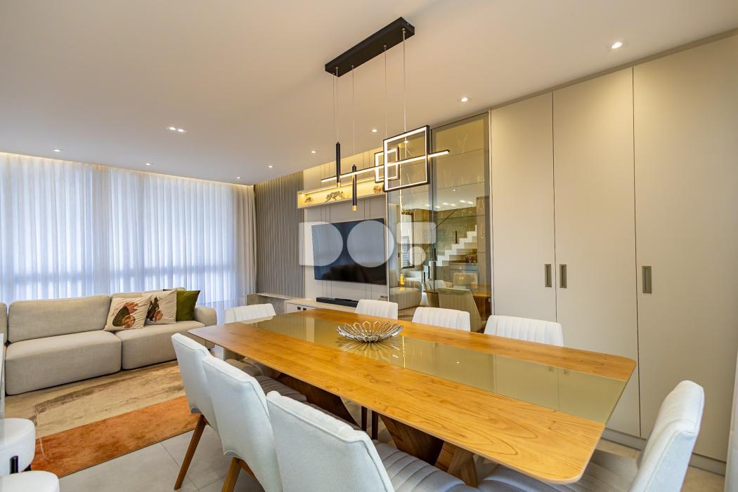 - Sala para dois ambientes jantar/estar mobiliadas e equipada com TV, home theater e lareira