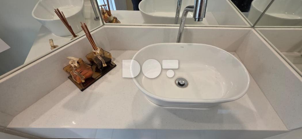 Banheiros equipados com cubas, mármore e acabamento sofisticado.